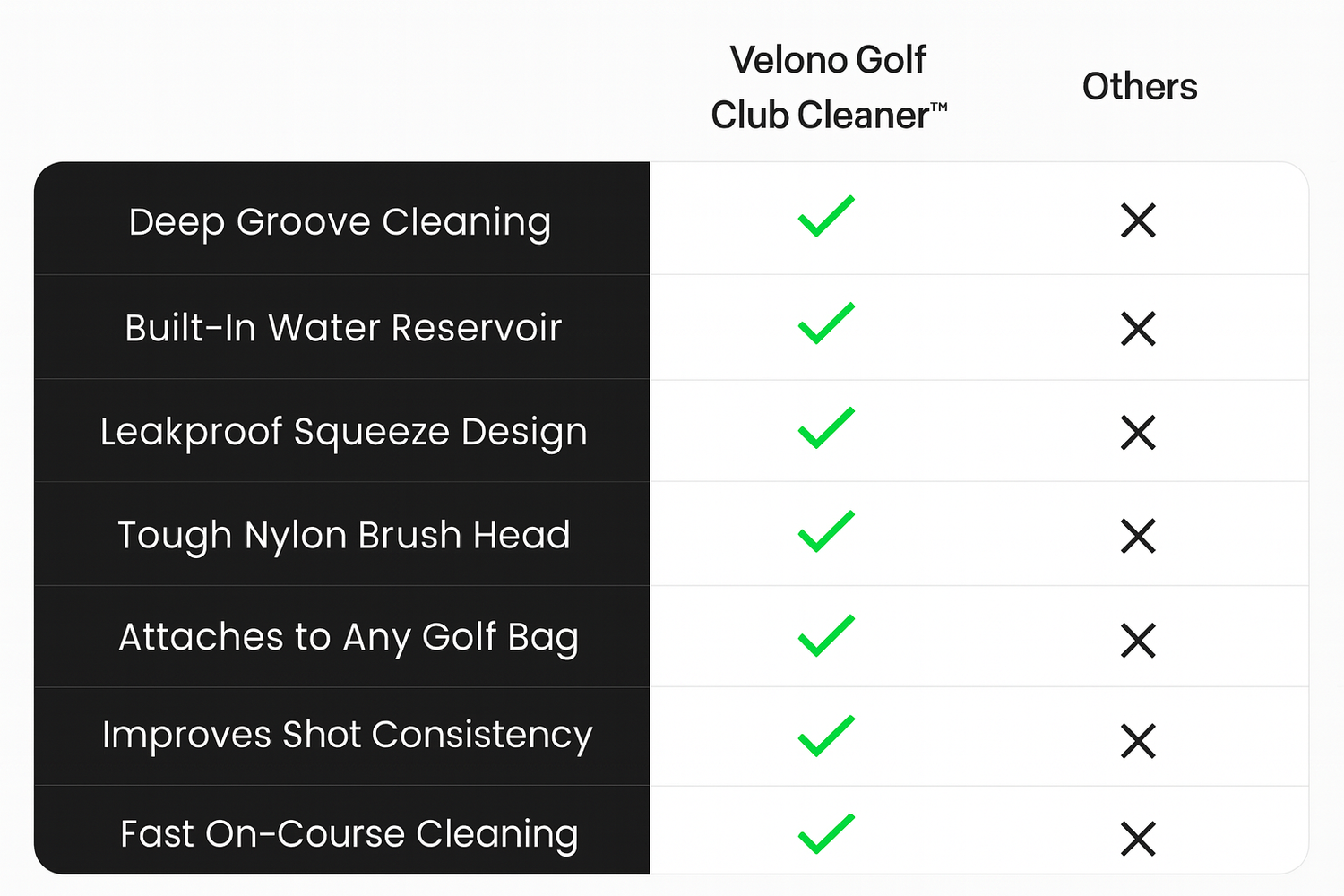 Every golfer knows the pain of watching a great swing turn into a weak, unpredictable shot — all because dirt and grass were packed into the grooves. The Velono Golf Club Cleaner™ restores clean grooves instantly with a pressurized water reservoir and a heavy-duty scrub brush. No more wiping clubs on your shorts, no more guessing whether the face is clean. Just pure, consistent contact, every swing, every hole.